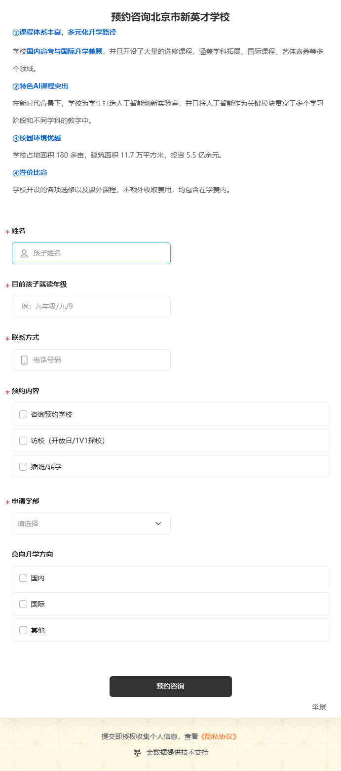 北京市新英才学校校园开放日预约通道开放,家长可在预约通道填写孩子姓名、就读年级、联系方式、预约内容、申请学部、升学意向等信息完成预约: