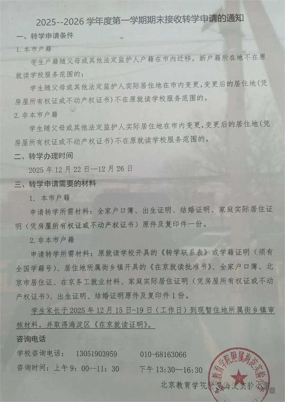 北京教育学院附属海淀实验小学2025-2026学年度第一学期期末接收转学申请的通知