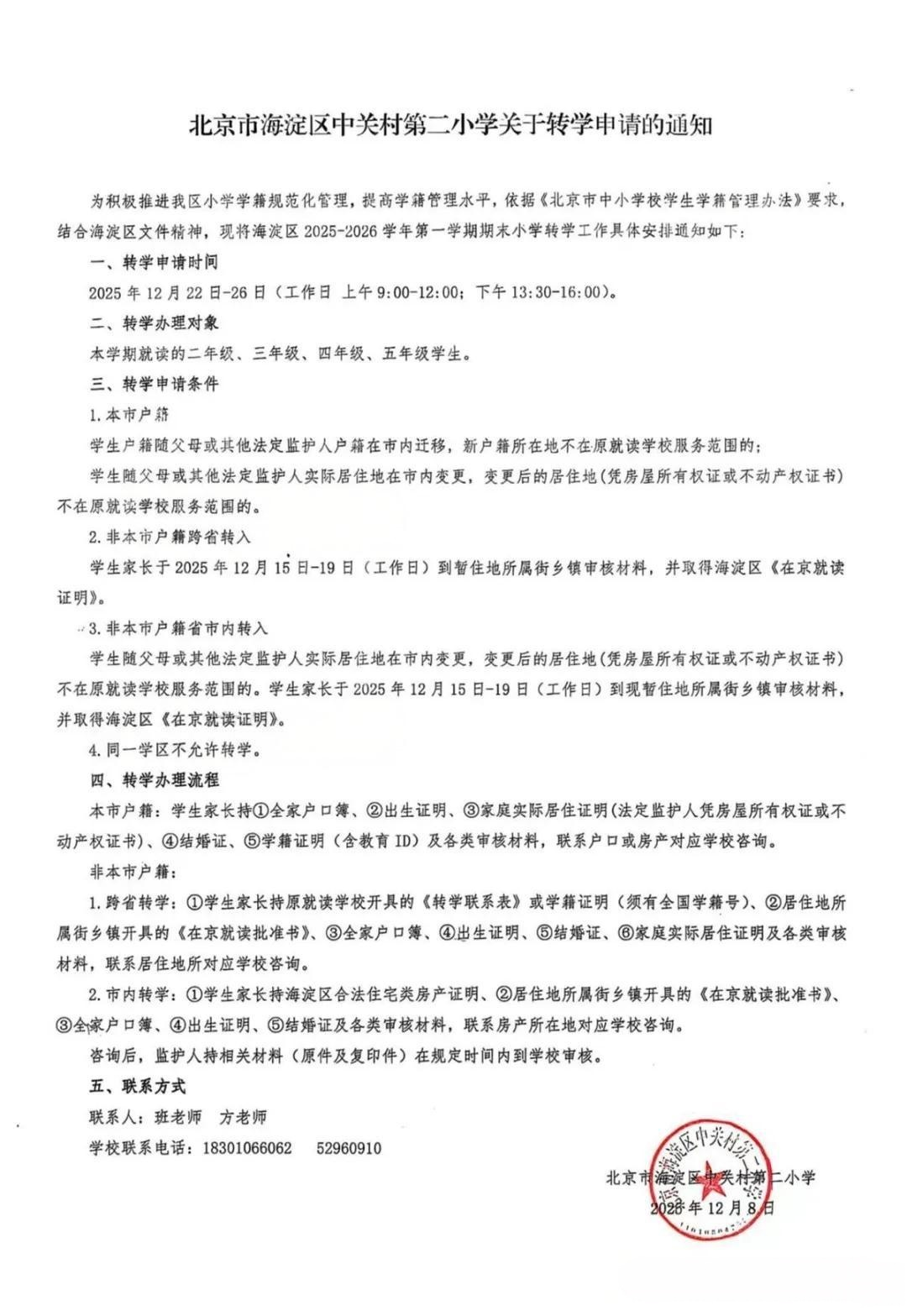 海淀区中关村二小百旺校区2025-2026学年第一学期期末转学申请已启动,仅受理二至五年级学生。京籍需户籍或海淀居住证明,非京籍需《在京就读证明》,按指定时间提交材料,学位统筹安排。