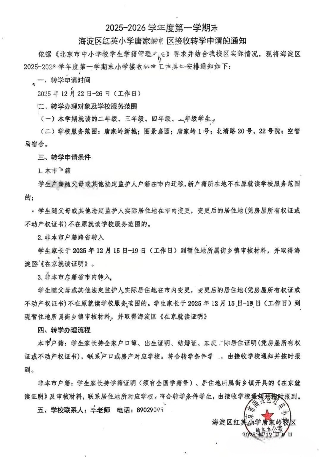 海淀区红英小学唐家岭校区发布2025-2026学年第一学期期末转学申请接收通知,起始年级首学期及六年级不予受理。申请对象为二至五年级学生,京籍需满足户籍迁移或实际居住地变更条件,非京籍需完成“四证”审核并取得《在京就读证明》。需备齐户口簿、学籍信息表等材料,按学校要求提交审核,学位紧张时由区教委统筹协调安置。